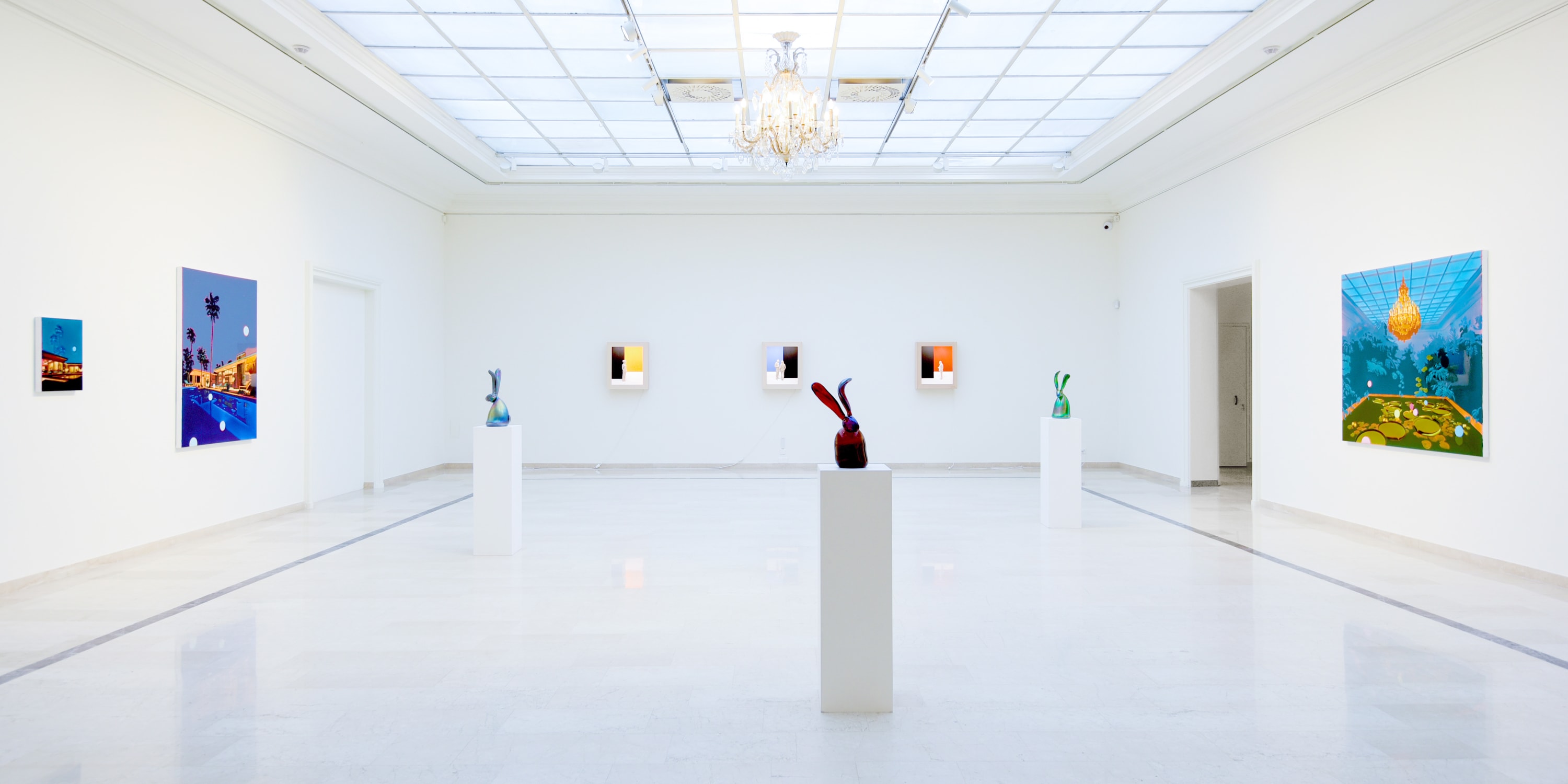 The "Bunnies" series of Hunt Slonem are exhibited together with Annemarie Terlage's latest body of works that are similarly composed through contrasts in colour and texture: each representing a personal memory of a landscape or composition aided by her creativity in the use of epoxy and acrylic paint. The playfulness and dreamy delicacy of the works of both artists set the viewer's gaze into a vivid motion along the paintings "In Bunnies and In Colour".